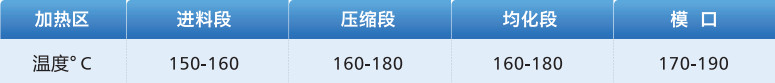 ▶ 以上温度参数仅供参考,由于各厂家设备不同,实际挤出温度需要根据相关设备具体配置在推荐的工艺温度基础上做调整。