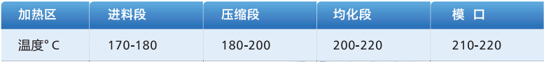▶ 以上温度参数仅供参考,由于各厂家设备不同,实际挤出温度需要根据相关设备具体配置在推荐的工艺温度基础上做调整。
